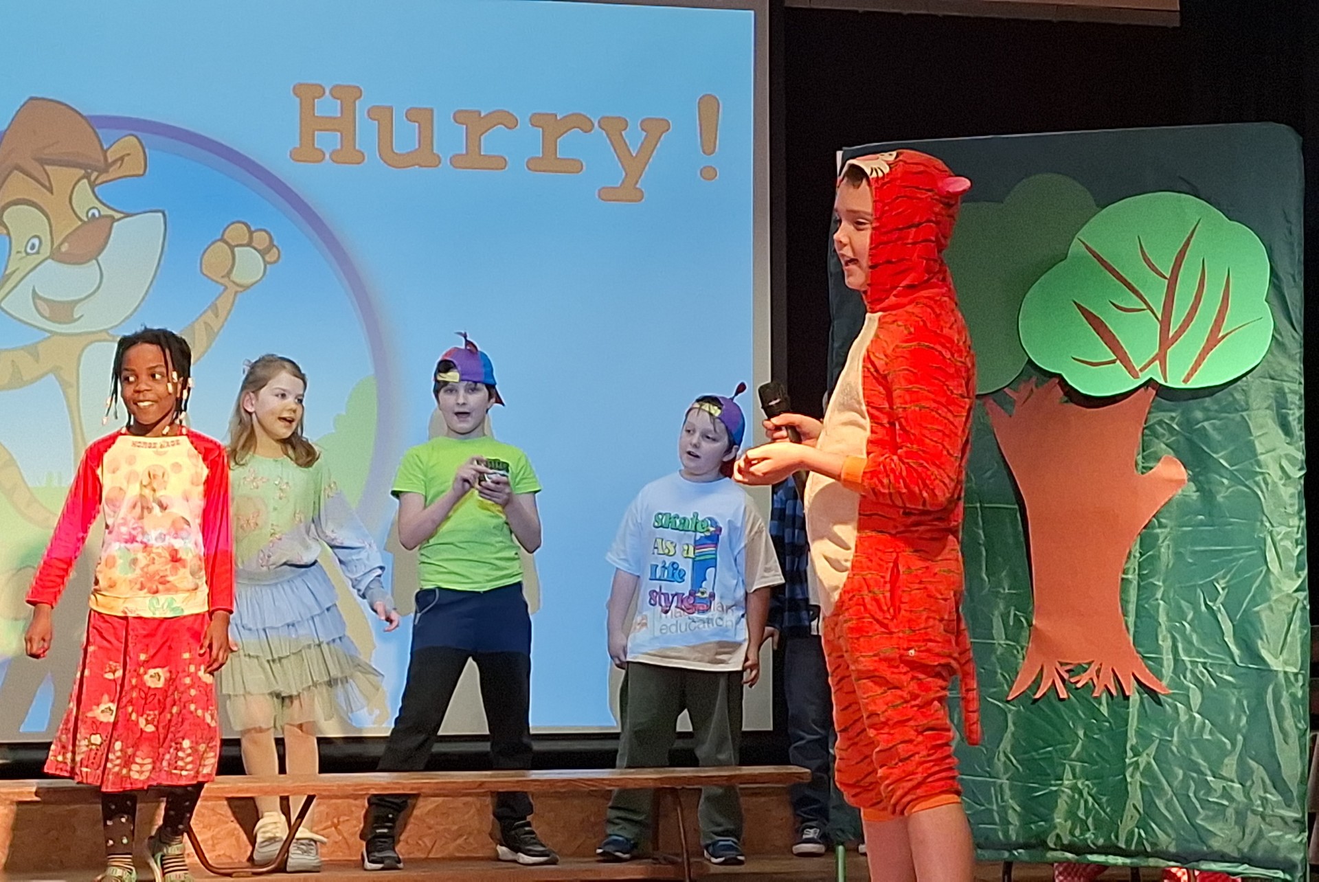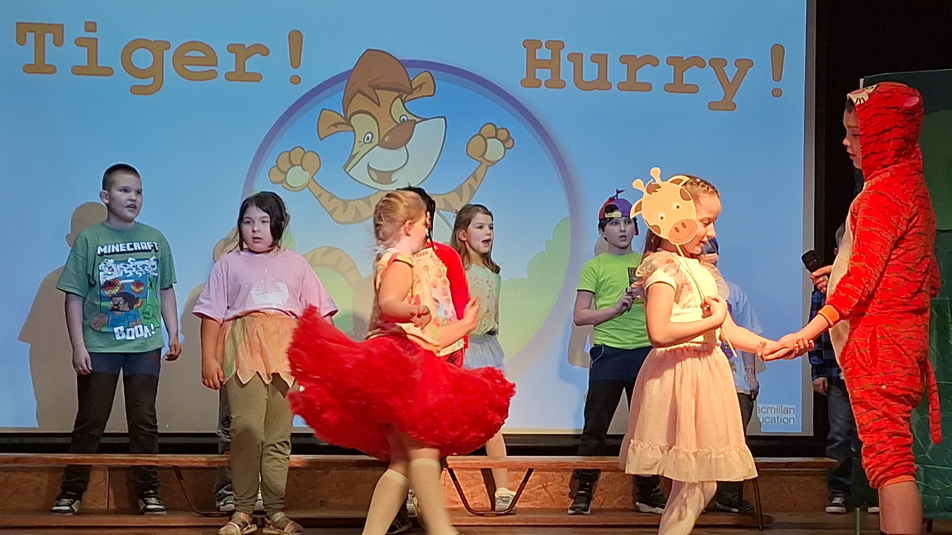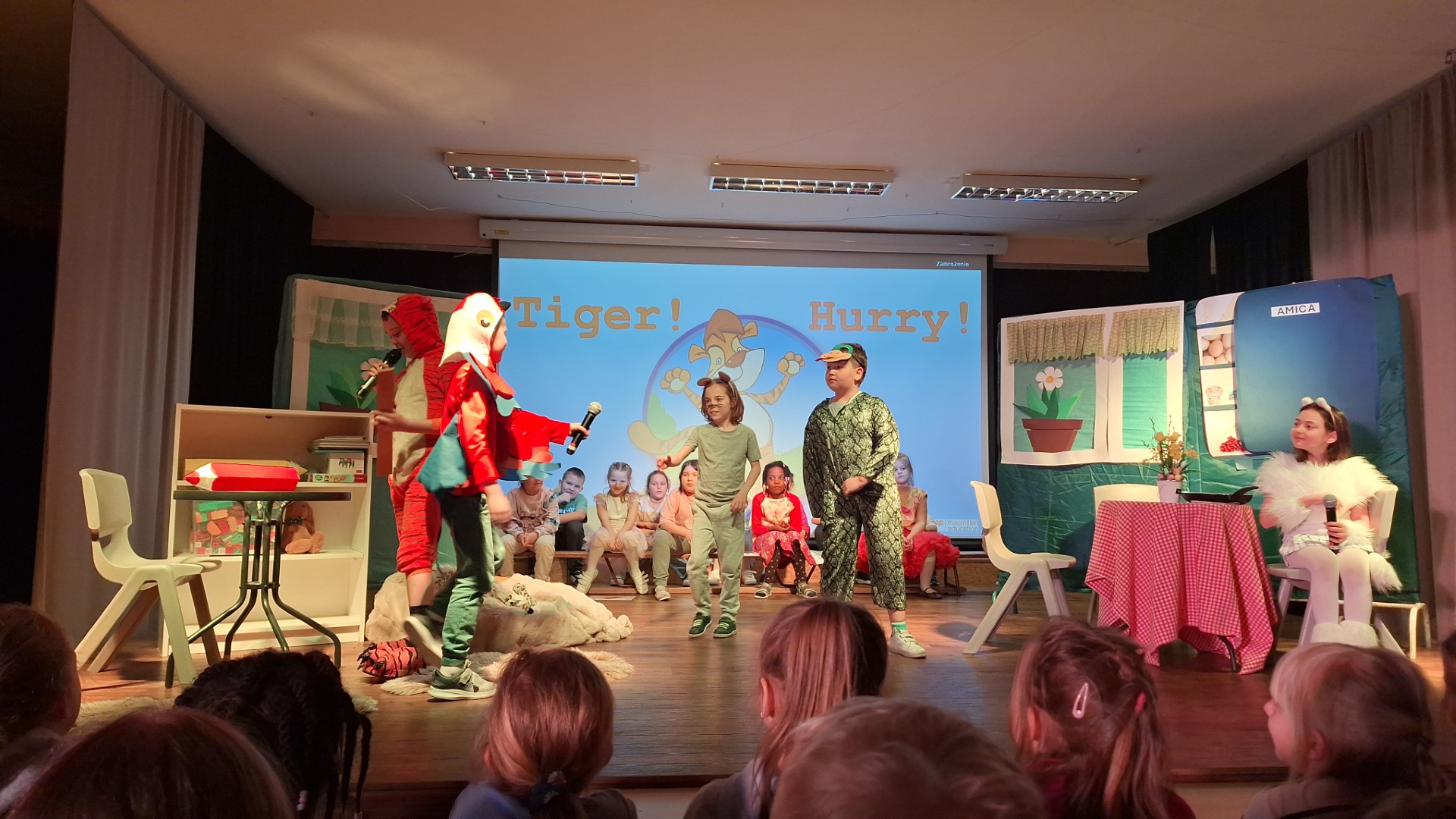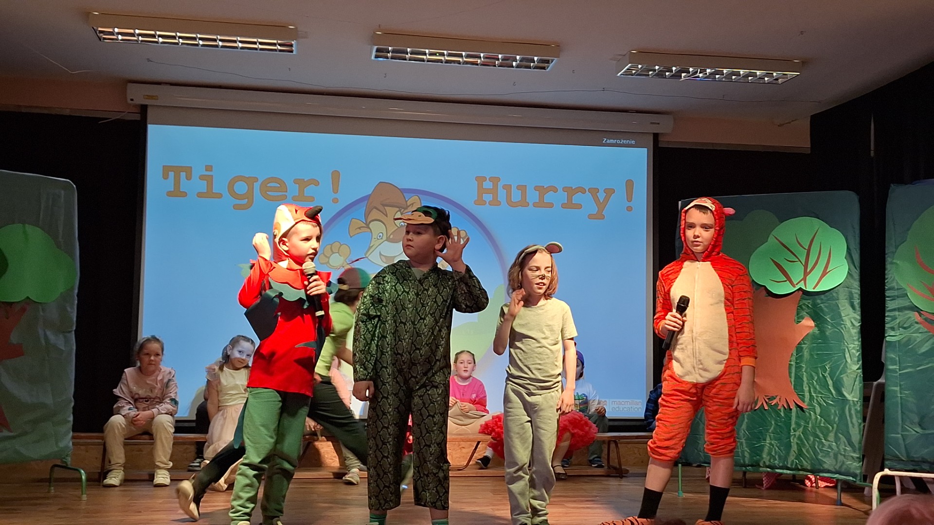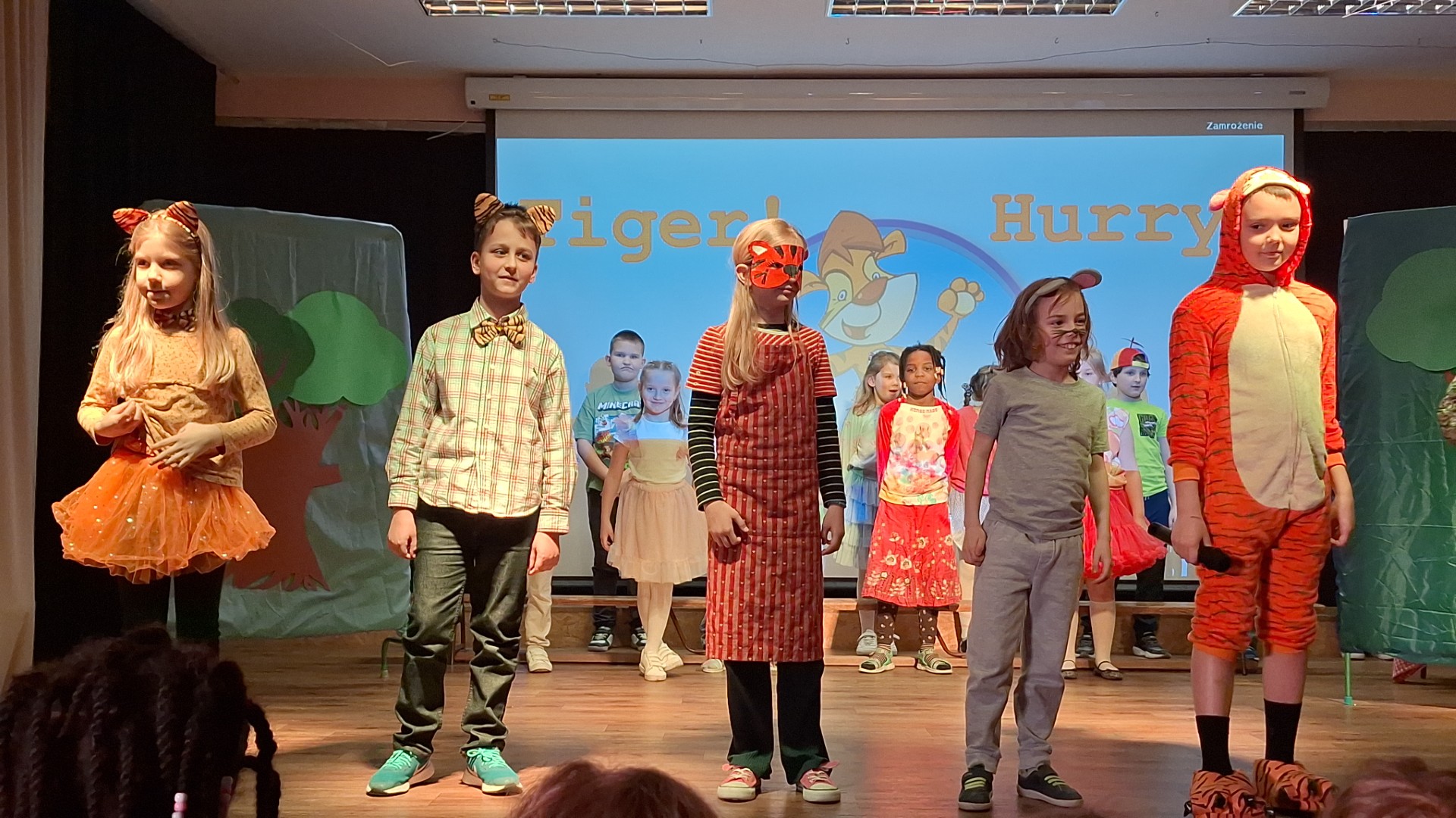10 kwietnia w naszej szkole odbył się Dzień Otwarty dla przyszłych pierwszaków i ich rodziców. Klasa 2d pod kierunkiem pani Katarzyny Stawiarz-Wiśniewskiej i pani Beaty Krakowskiej przygotowała przedstawienie w języku angielskim pt. Tiger! Hurry! Mali widzowie z radością obserwowali przygody wesołego tygryska i jego przyjaciół.